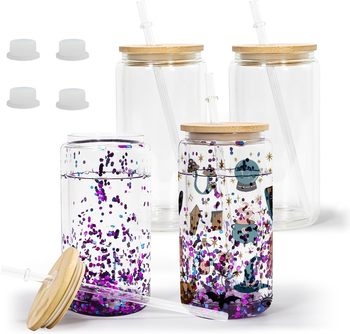 Gobelet en verre à double paroi pré-percé de 16oz 20oz avec couvercle en bambou, paille, chope à bière transparente, globe de neige pailleté, verres à sublimation